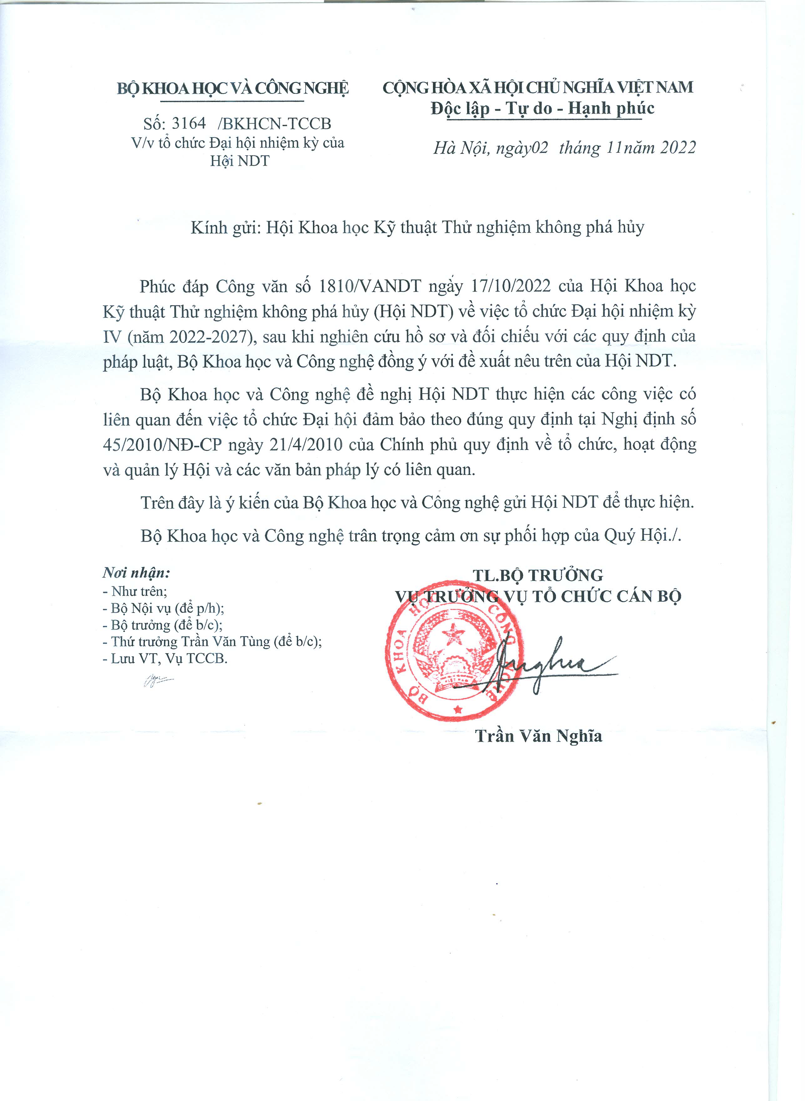 Ngày 02/11/2022, Bộ Khoa học và Công nghệ đã có công văn trả lời số 3164/BKHCN-TCCB do Vụ trưởng Vụ Tổ chức cán bộ Trần Văn Nghĩa ký về việc đồng ý với đề xuất tổ chức Đại Hội nhiệm kỳ IV (2022-2027) của Hội Thử nghiệm không phá hủy (VANDT).